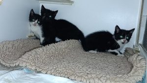 Als letztes ließ sich heute das schwarze Kitten sichern, nun sind alle vier wieder vereint. Zweimal schwarz-weiß, je einmal grau (wollte nicht fotografiert werden